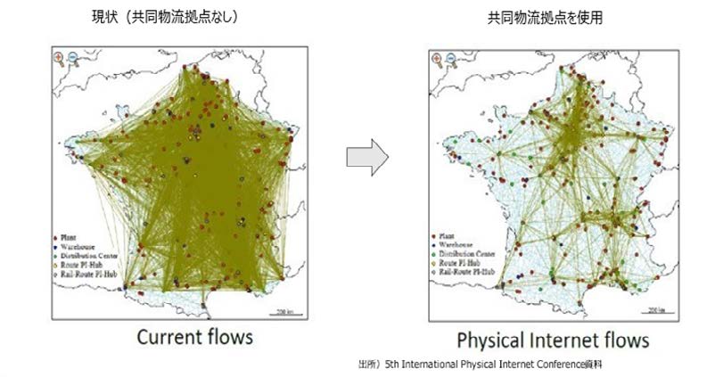 余裕のある物流センターなどのアセットを介して、トラックなどの輸送手段を活用して目的地まで運ぶことから、2019年春に日本にフィジカルインターネットを紹介した上智大学名誉教授の荒木はフィジカルインターネットのことを「究極のオープンな共同輸送・配送」と言った。